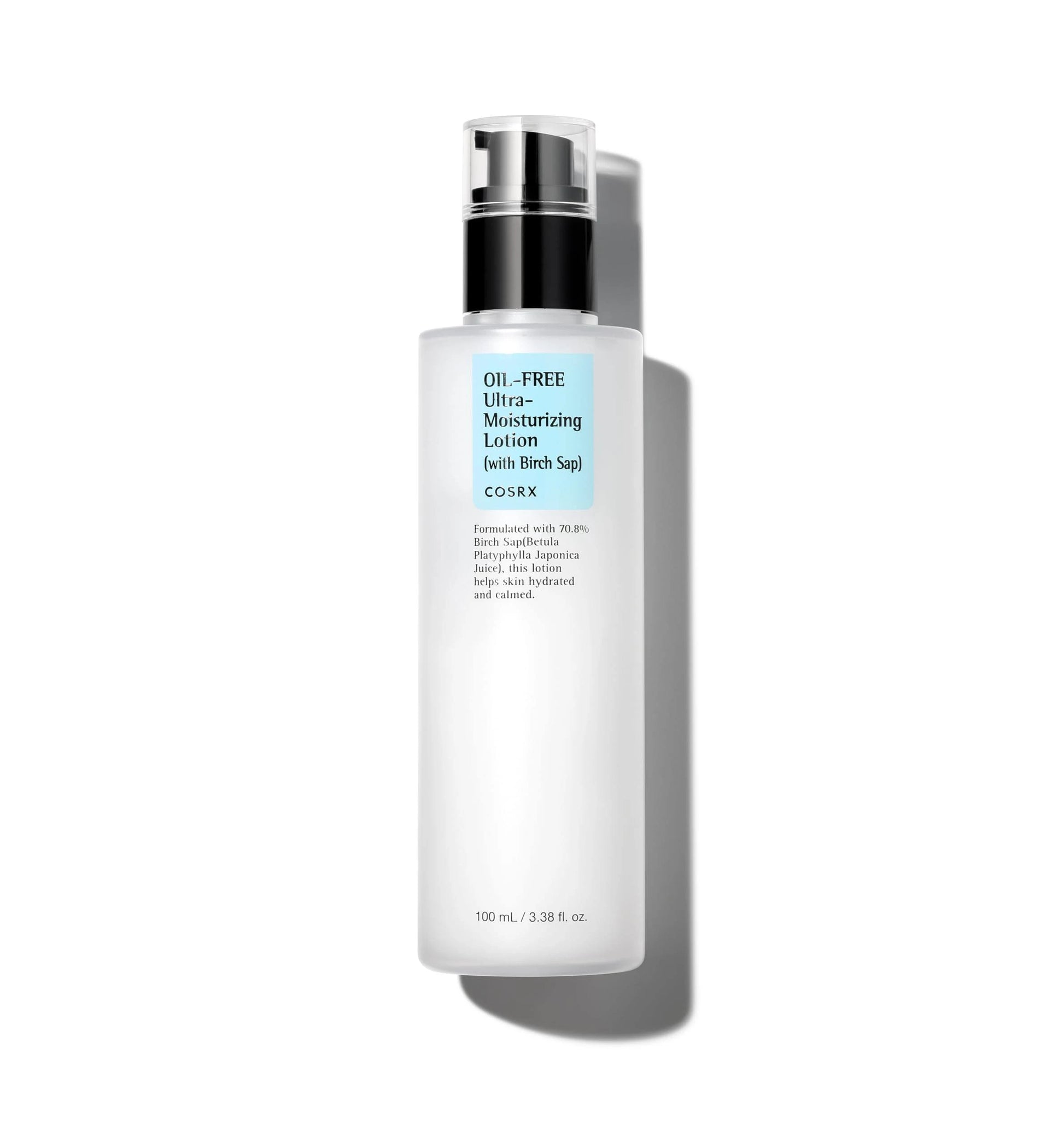 Oil Free Ultra Moisturizing Lotion de Cosrx está formulada con un 70% de savia de abedul natural, ideal para pieles sensibles, grasas o propensas al acné