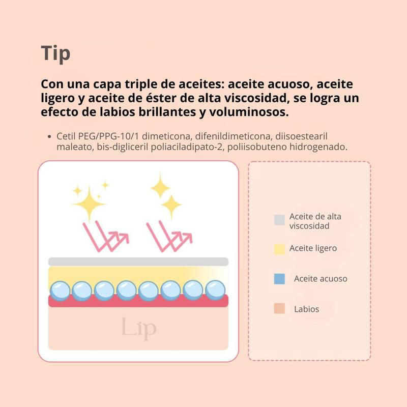 Gracias a la alta concentración de este aceite y a sus propiedades, la tinta hidrata profundamente, manteniendo tus labios suaves y nutridos. Tiene un acabado brillante (glossy) y cristalino que aporta un toque de elegancia a tu look.