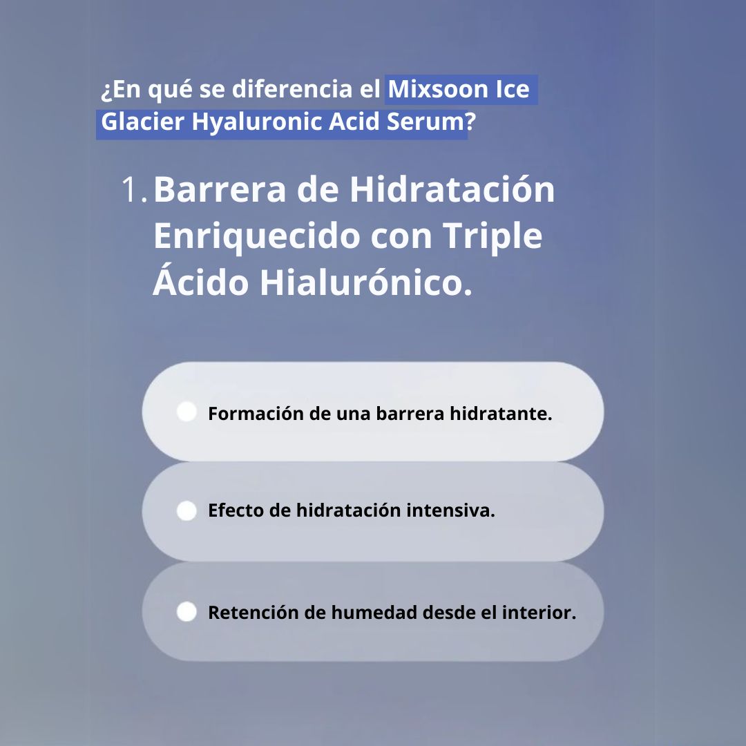 Uno de los productos más vendidos de MIXSOON, este sérum refrescante y ultraligero es la clave para una piel tersa y radiante. Sus dos ingredientes estrella son el Agua de Glaciar de Alaska, rica en nutrientes, para purificar la piel, y tres formas diferentes de ácido hialurónico para retener la hidratación y evitar que se pierda. Su fórmula acuosa se absorbe rápidamente, dejando la piel tersa, hidratada y con un brillo radiante. ¡Apto para todo tipo de piel, incluidas las sensibles!