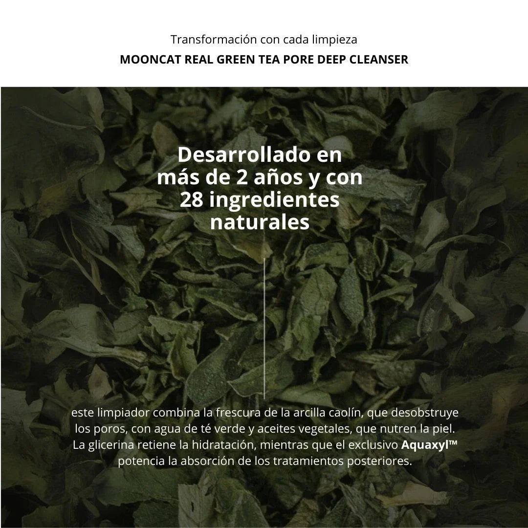 MOONCAT Real Green Tea Pore Deep Cleanser combina la arcilla caolín con el poder antioxidante del té verde para ofrecer una limpieza profunda que transforma tu piel desde la primera aplicación. Su fórmula elimina impurezas y residuos incrustados en los poros, mientras hidrata y nutre la piel, dejándola suave, equilibrada y sin sensación de tirantez. Ideal para quienes buscan una piel limpia, fresca y saludable con un solo paso