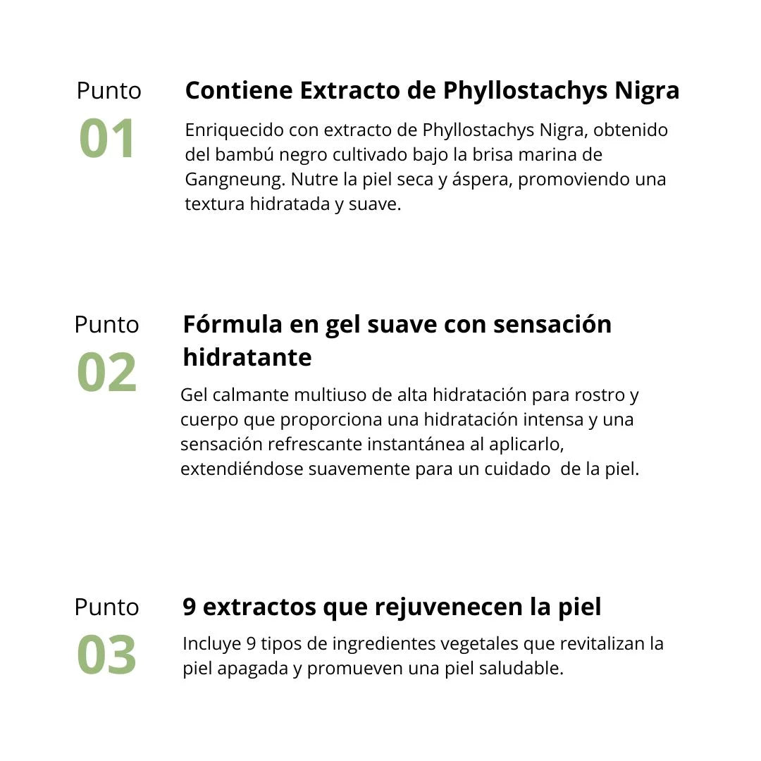 Fresh Bamboo shooting es un gel súper hidratante y calmante, contiene un 99% de extracto de bamboo negro y vitaminas extraídas de frutas, componentes que le brindan propiedades regeneradoras, refrescantes y calmantes
